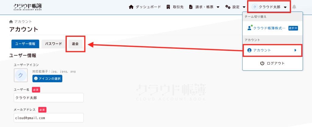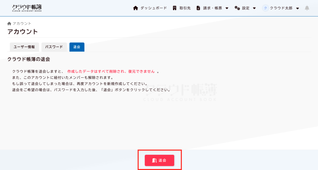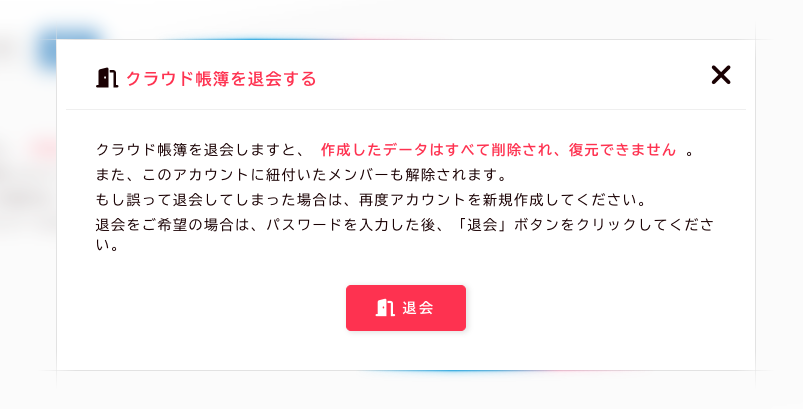 アカウントを削除すると、アカウント内で作成した各書類および個人情報は完全に削除され、復元できなくなりますので、あらかじめご了承ください(メンバーアカウントも削除されますのでご注意ください)。