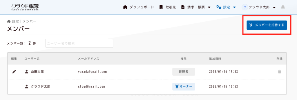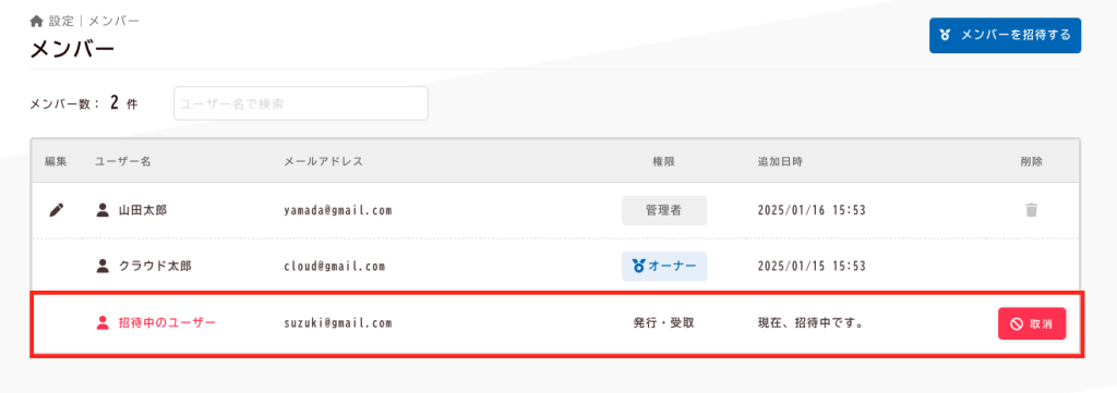 招待を実行すると、招待されたメンバーがリストに表示され、そのメンバーにはメールアドレス宛に招待メールが送信されます。