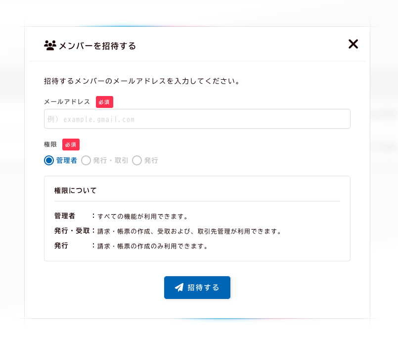 招待したいメンバーの「メールアドレス」と「権限」を設定し、「 招待する」ボタンをクリックしてください。