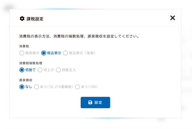 課税設定では「消費税」「消費税端数処理」「源泉徴収」の設定が変更できます。