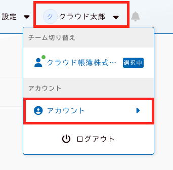 ヘッダーメニューの「自分の名前」から「アカウント」をクリックしてください。