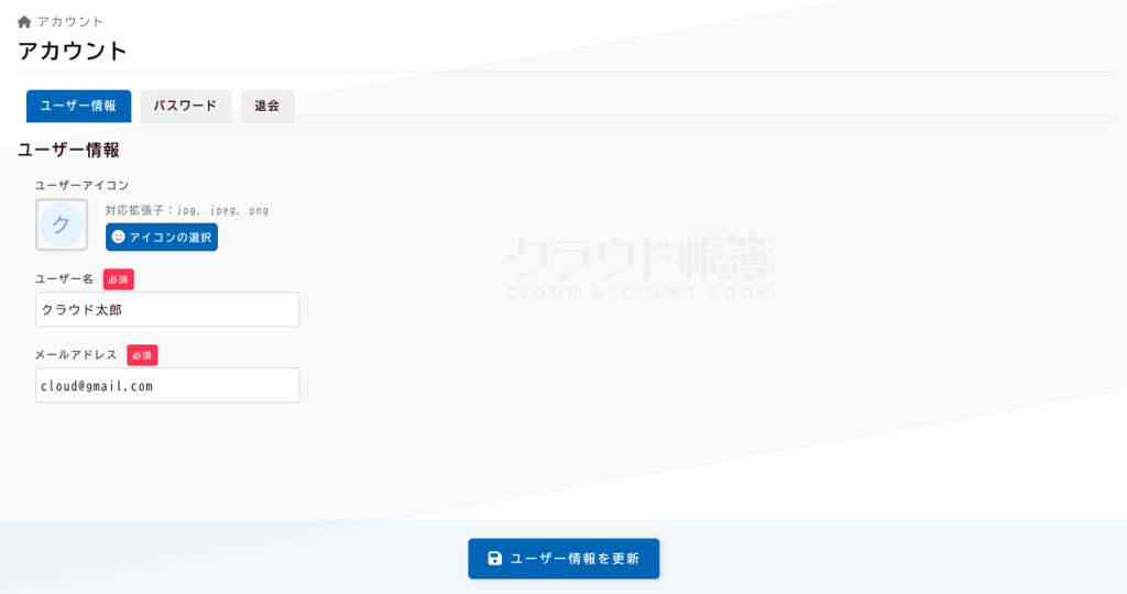 アカウント画面では「ユーザー情報」「パスワード」を変更することができます。