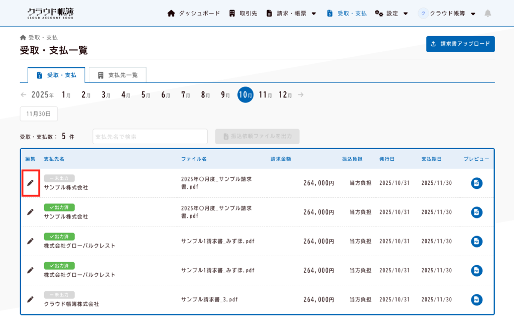 アップロードした請求書は編集できますか? 「 (編集)」アイコンをクリックすると、請求書の編集画面が開きます。 なお振込依頼ファイルを出力し、ステータスが「出力済」された請求書については編集できません。