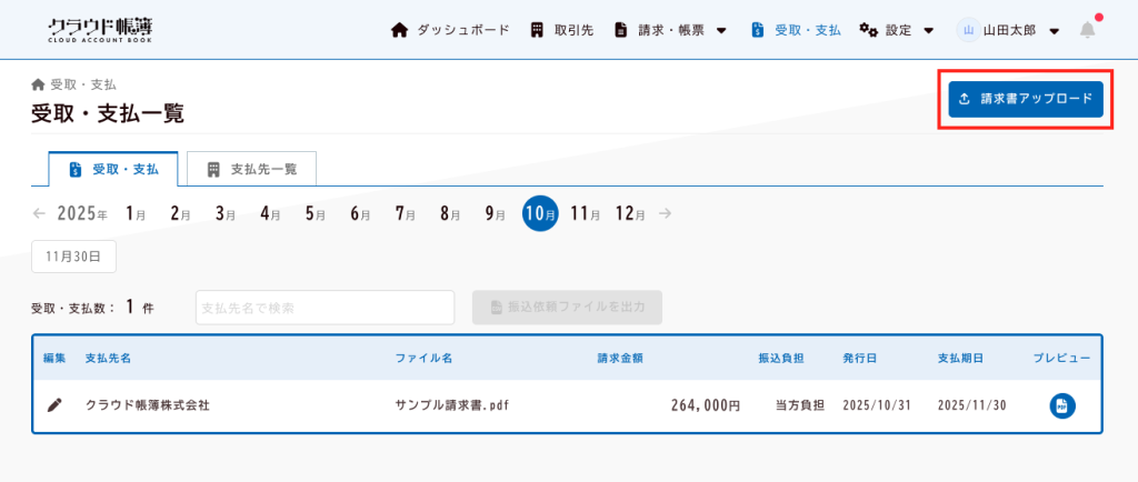 【受取・支払】画面で「 請求書アップロード」ボタンをクリックしてください。