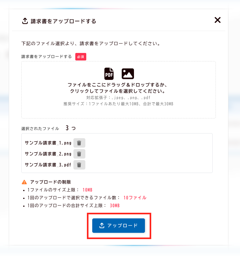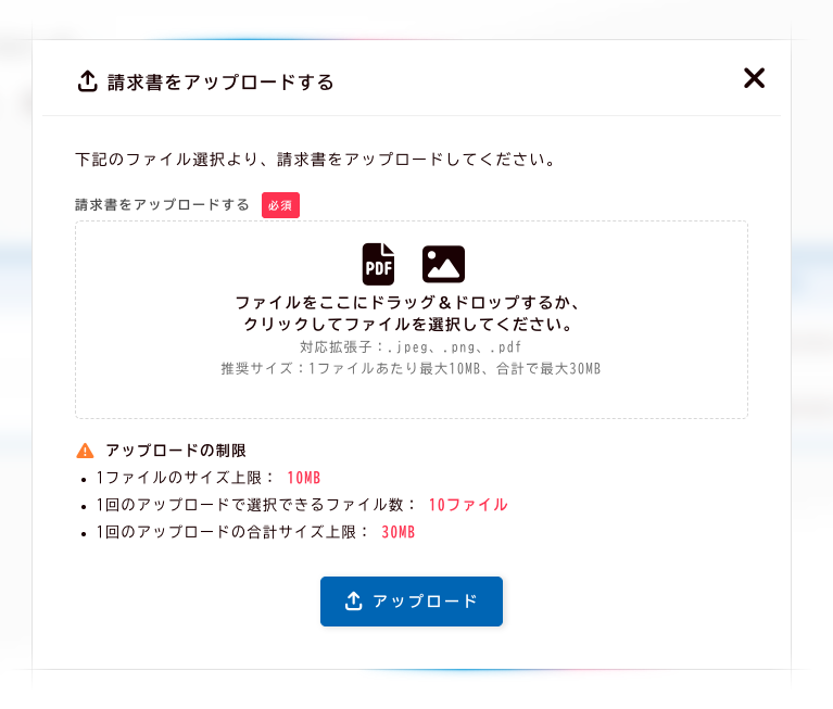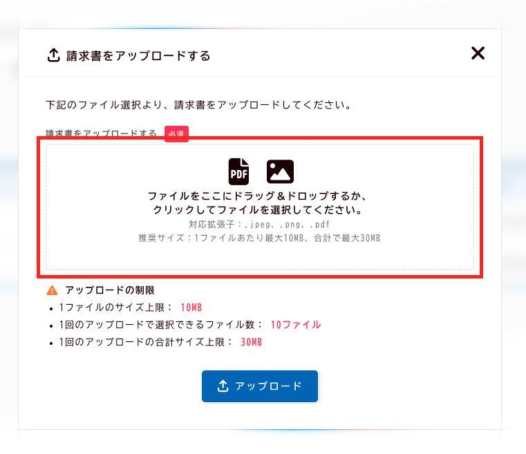 また、請求書ファイルをアップロードする際には、以下の制限があります。